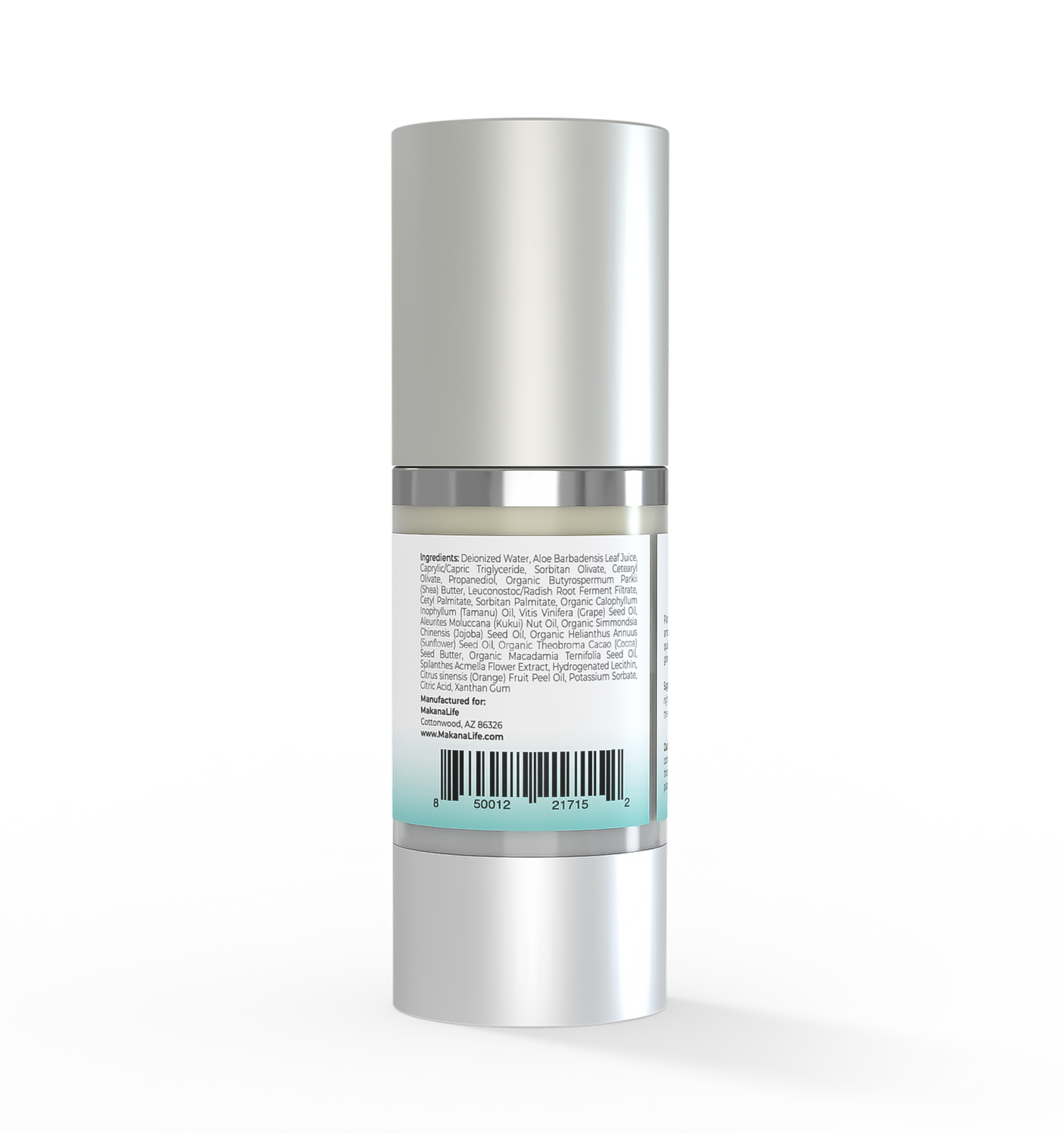 Lock in moisture, plump skin, and smooth fine lines for a youthfully restored complexion. Makana Anti-Aging Cream is formulated with Tamanu Oil known to help nourish skin to reduce the appearance and depth of wrinkles. Rich in fatty-acids, Tamanu Oil is an age-old secret for keeping skin young. (1) Loaded with essential fatty acids, Alpha-linoleic, Oleic, Linoleic, Palmitic, Arachidonic and Stearic acids, Tamanu Oil helps maintain healthy, tight-looking skin. Additionally, Makana’s Anti-Aging cream is packed with Kukui Oil to replenish lost moisture and re-hydrate your facial skin and Orange Peel Oil for a Vitamin C boost to help refresh the skin, leaving you with a bright, luminous glow.